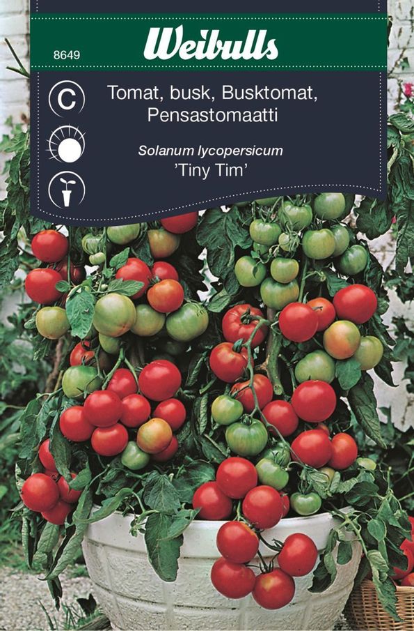 En tomat med kompakt växtsätt. Fin i liten urna på altan. Bildar många goda frukter. Odling: Så inomhus i såjord i februari-april. Så grunt. Gror efter 7-10 dagar vid 20-25 grader. Hög groningstemperatur är viktig. Odla sedan svalare. Plantera om i krukor med plantjord. Plantera ut på skyddad plats när dygnstemperaturen konstant är över 8 grader. Låt plantan växa fritt. Beskärning behövs ej men ruska gärna blomklasarna för bättre fruktsättning. Gödsla och vattna ordentligt. Mer information Artikel nr: 8649 Såperiod: Feb-April Växtsätt: Busk Höjd: 75 cm Plantavstånd: 40 cm Radavstånd: 50 cm Planteringsdjup: 0,5 cm Vetenskapligt namn: Solanum lycopersicum Periodskörd: Juni-Sept Räcker till: Ca. 20 planter