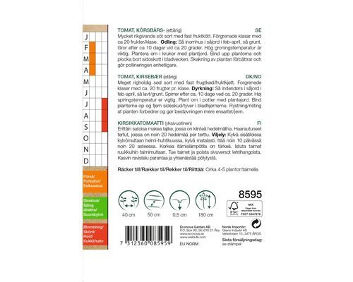Mycket rikgivande söt sort med fast fruktkött. Förgrenade klasar med ca 20 frukter/klase. Odling: Så inomhus i såjord i feb-april, så grunt. Gror efter ca 10 dagar vid ca 20 grader. Hög groningstemperatur är viktig. Plantera om i krukor med plantjord. Bind upp plantorna och plocka bort sidoskott i bladvecken. Skakning av plantan förbättrar och gör pollineringen enhetligare. Mer information Såperiod: Feb-April Blomningstid: Juli-sept Höjd: 180 cm Växtavstånd: 40 cm Planteringsdjup: 0,5 cm Räcker till: Ca. 4-5 plantor