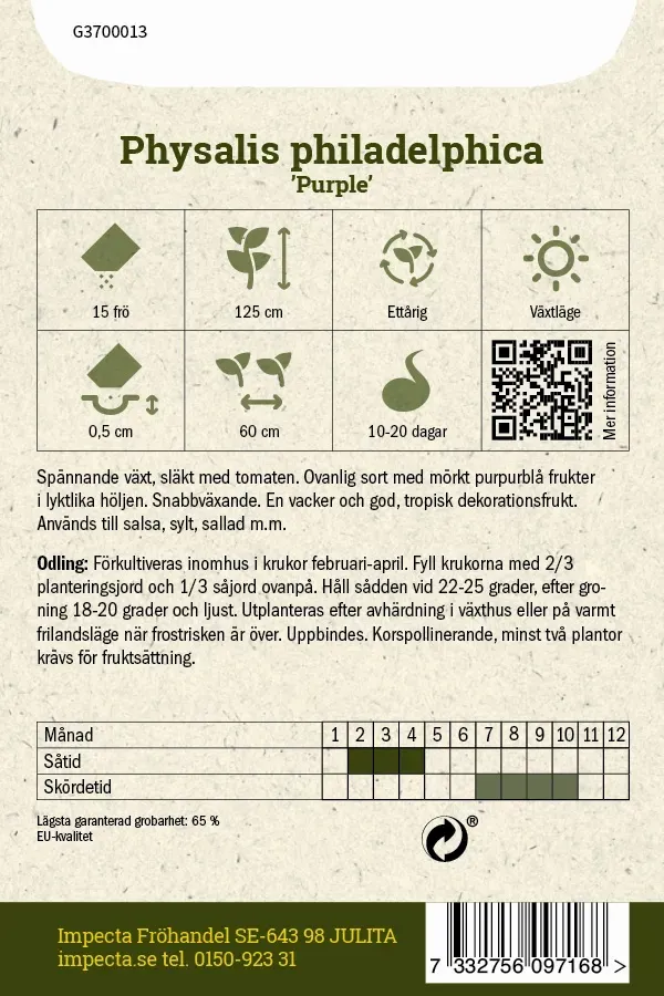 Spännande och ovanlig med purpurblå frukter i lyktlika höljen. Snabbväxande. Vacker och god, tropisk dekorationsfrukt. Används till salsa, sylt, sallad m.m.