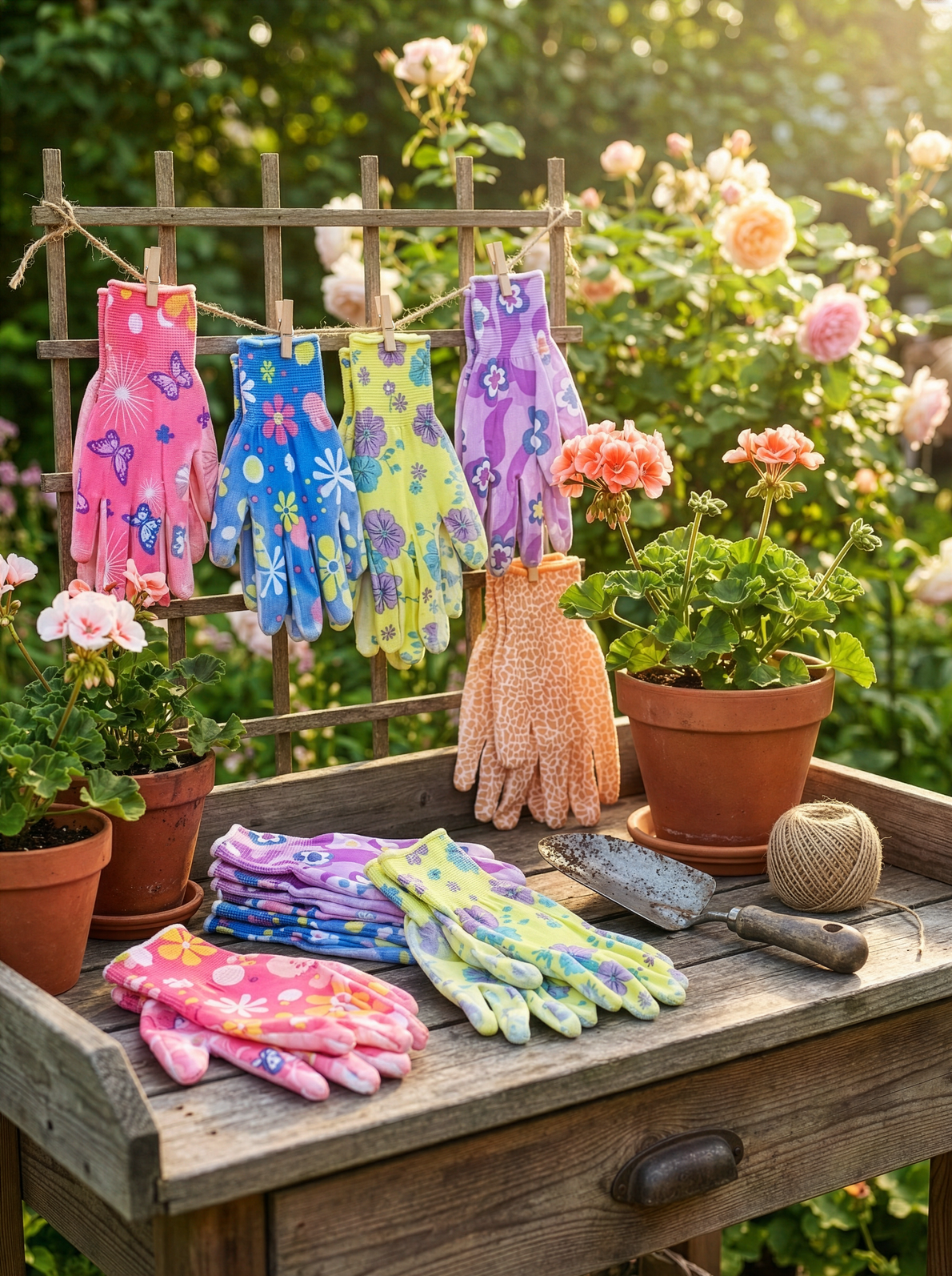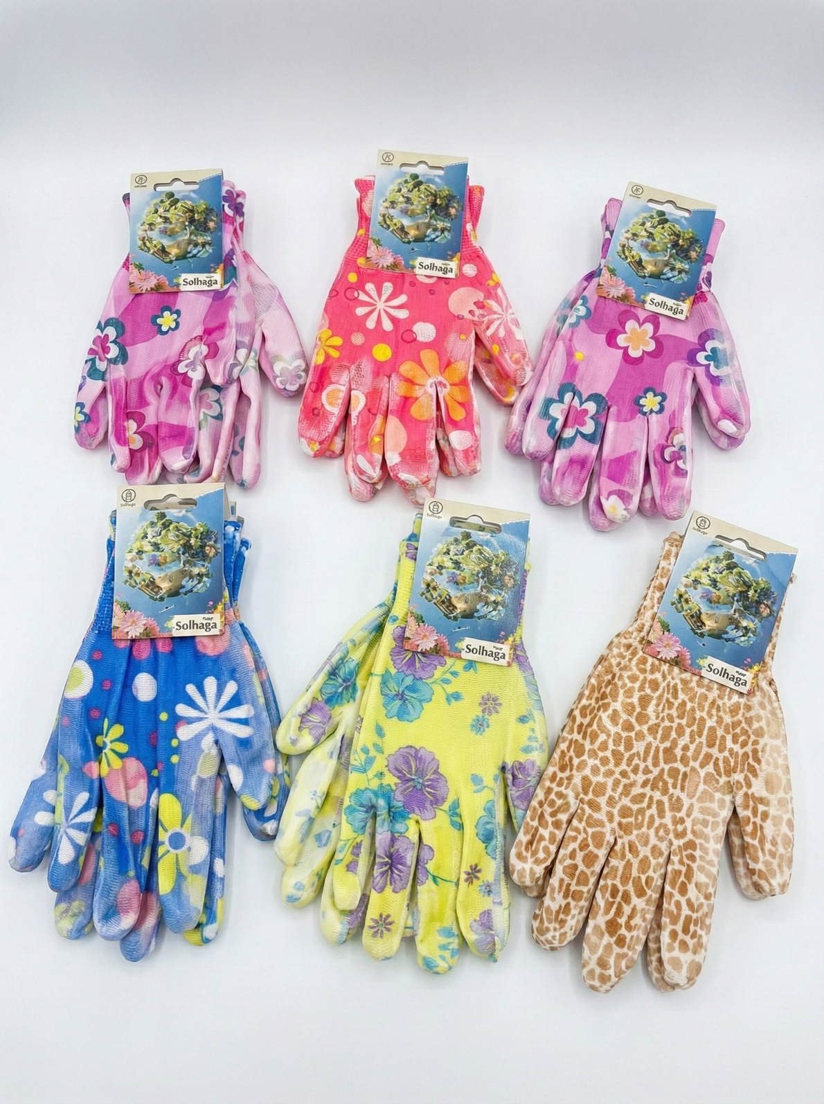 Trägårdshandske i mängder av roliga mönster och färger. Gummerade på insidan. Storlek 7.