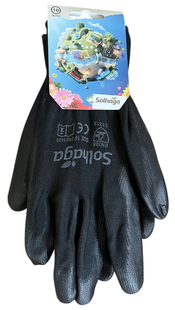 Trevlig arbetshandske som passar för alla typer av trädgårdsarbete. Tillverkad av svart polyester och polyuretan med gummerad yta. Finns i storlekar 7-10.