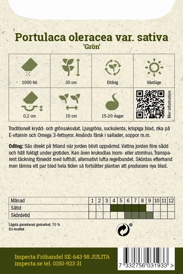 Traditionell krydd- och grönsaksväxt. Ljusgröna, suckulenta, krispiga blad, rika på E-vitamin och Omega 3-fettsyror. Används färsk i sallader, soppor m.m.