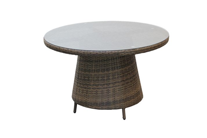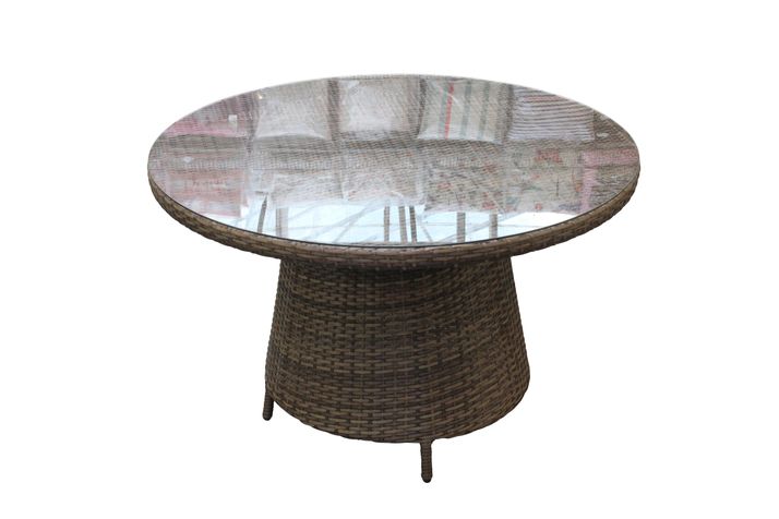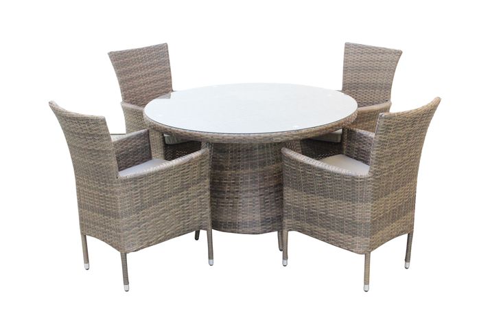 Stilren matgrupp med runt matbord (Ø120xH75 cm) och 4 stapelbara Björngräs fåtöljer, tillverkade i 8 mm bred, naturfärgad, slitstark konstrotting och stomme av kraftig aluminium, bordstoppen är av 5 mm tempererat glas.