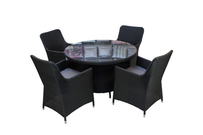 Stilren matgrupp med runt matbord (Ø120xH75 cm) och 4 stycken Ullblad fåtöljer, tillverkade i 8 mm bred, svart, slitstark konstrotting och stomme av kraftig aluminium, bordstoppen är av 5 mm tempererat glas.