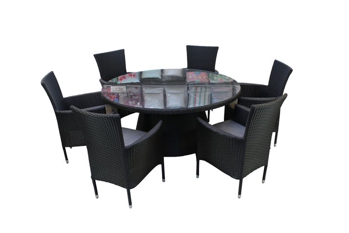 Stilren matgrupp med runt matbord (Ø150xH75 cm) och 6 stapelbara Björngräs fåtöljer, tillverkade i 8 mm bred, svart, slitstark konstrotting och stomme av kraftig aluminium, bordstoppen är av 5 mm tempererat glas.