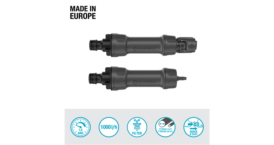 Vid behov kan du enkelt montera loss filtret för att rengöra det. För att du ska kunna ansluta både 4.6 mm (3/16″) Fördelarrör och 13 mm (1/2″) Anläggningsrör är Tryckutjämnare 1000 konstruerad med flexibel anslutning via adapter.Tack vare den patenterade anslutningstekniken Quick & Easy, kan du enkelt ansluta, ta isär och flexibelt bygga på systemet. I slutet av trädgårdssäsongen eller om det är risk för frost kan du ta loss tryckutjämnaren med några enkla steg och sedan förvara den på ett frostsäkert ställe.