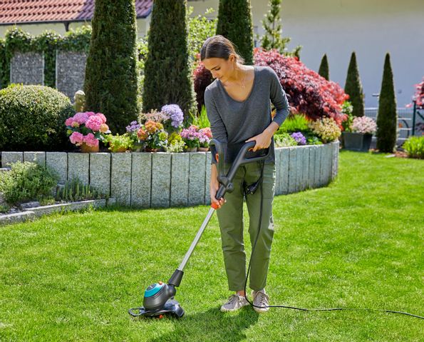 Turbotrimmern EasyCut 450/25 från GARDENA utmärks av flera användbara funktioner som gör det enklare att hålla trädgården prydlig – särskilt på svåråtkomliga ställen och längs gräsmattans kanter.