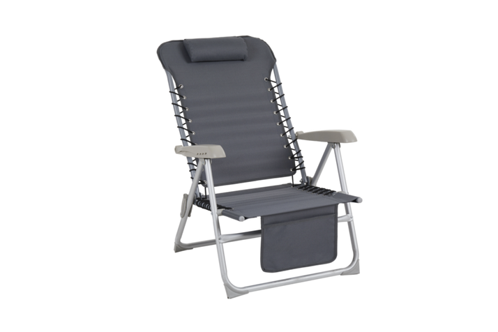 Nätt och stapelbar strandstol med aluminiumstomme och slitstark polyester. Ficka framtill.