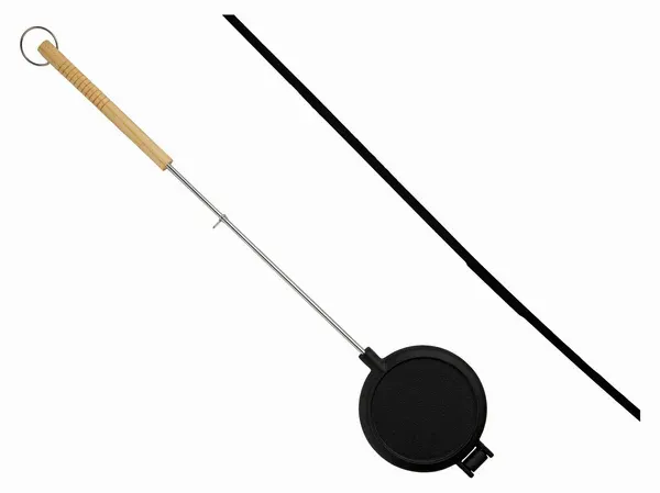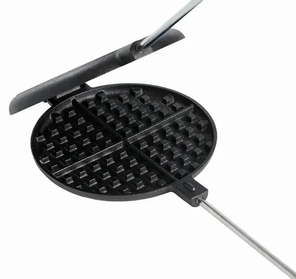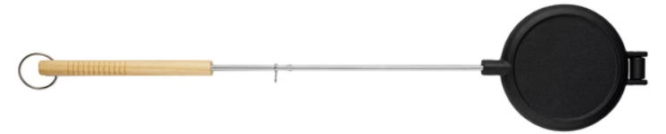 Med detta våffeljärn är det lätt att hälla på smeten och hålla den över elden.