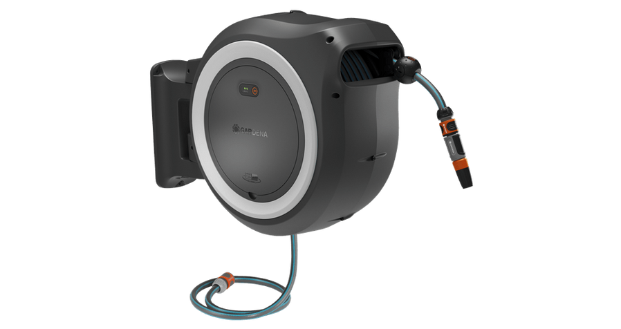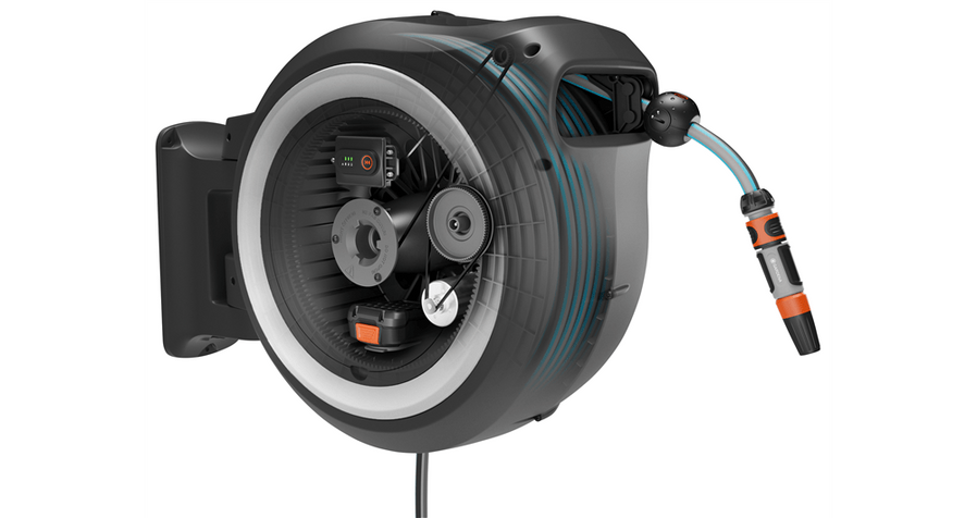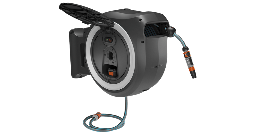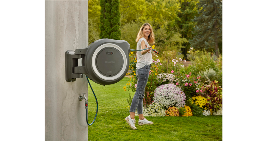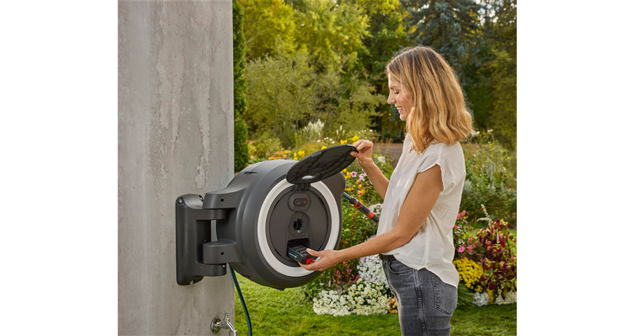 Den 40 m långa trädgårdsslangen har en fjärrkontroll i slangänden som kan användas för att bekvämt aktivera den batteridrivna upprullningen. Slangen rullas upp på ett kontrollerat sätt utan att trassla in sig eller korva sig tack vare den integrerade slangföringen och funktionen RollControl+. Upprullningshastigheten minskas ytterligare de sista två meterna för att undvika sakskador. Slangförvaringsboxen gör därmed bevattningsarbetet till en bekväm och kontrollerad aktivitet.