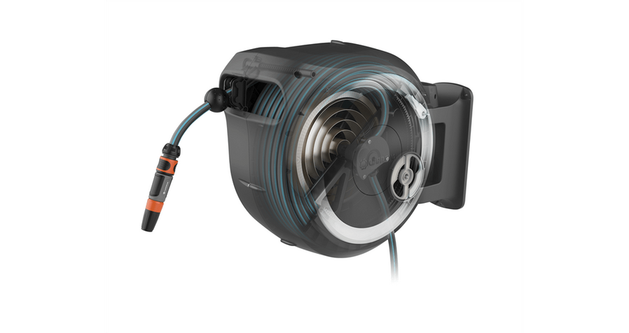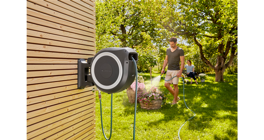 Tack vare väggfästet kan boxen svängas 180°. Med den 35m långa trädgårdsslangen når du enkelt alla hörnen i en stor trädgård. Tack vare boxens rörlighet får du extra stor räckvidd och slangen hindras från att vikas eller sno sig. Slangen dras enkelt ut för vattning, och tack vare särskilt korta låspunkter låses den automatiskt vid önskad längd när du slutar dra. Så snart bevattningen är klar och låset lossas med ett lätt ryck drar den integrerade fjädern automatiskt in trädgårdsslangen på ett tillförlitligt sätt.