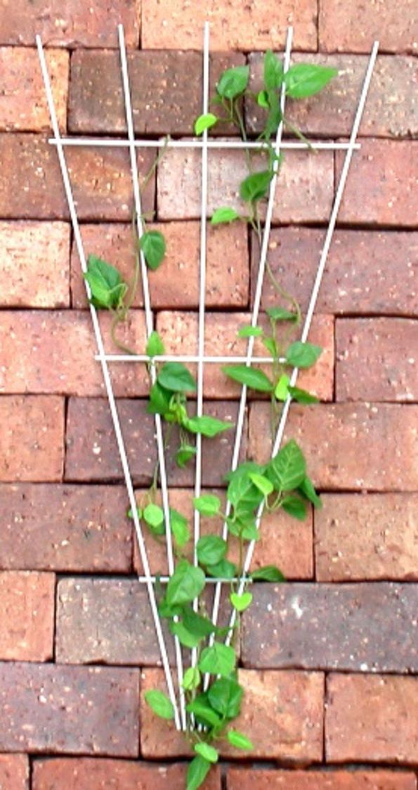 Spaljé i form av solfjäder, tillverkad av 4 mm vit pulverlackerad metall. Mått: B75xH150 cm