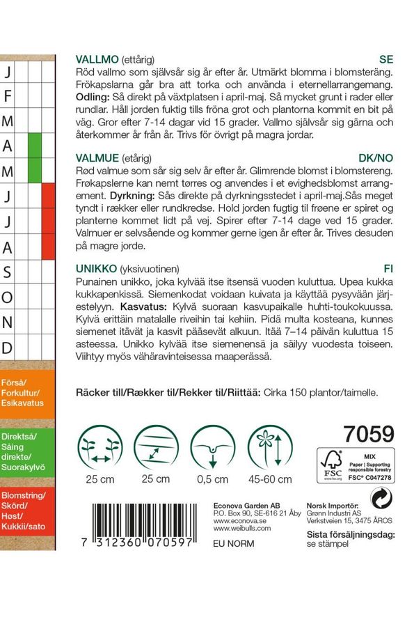 Odling: Så direkt på växtplatsen i april-maj. Så mycket grunt i rader eller rundlar. Håll jorden fuktig tills fröna grot och plantorna kommit en bit på väg. Gror efter 7-14 dagar vid 15 grader. Vallmo självsår sig gärna och återkommer år från år. Trivs för övrigt på magra jordar.