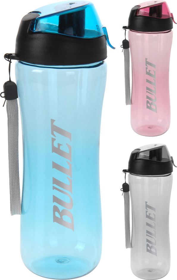 Vattenflaska med drickpip under lock. Praktisk ögla att fästa runt exempelvis handleden vid löpning.