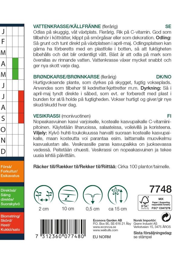 Odling: Så grunt och tunt direkt på växtplatsen i april-maj. Odlingsplatsen kan gärna ha förberetts med en plastfolie i botten, så att fuktigheten bibehålls och det blir ordentligt vått. Bäst är att odla på mark som översilas av rinnande vatten. Vattenkrasse växer mycket snabbt och ger nya skott varje dag.