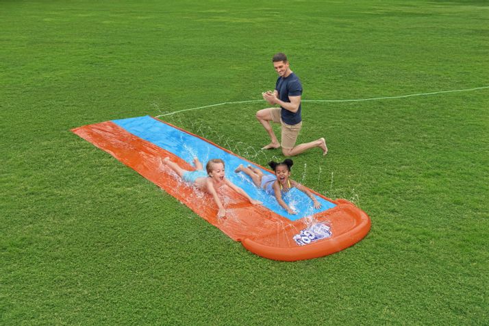 En vattenslide Dubbel från Bestway, perfekt för barnen. Enkel att montera och koppla i trädgårdsslangen.