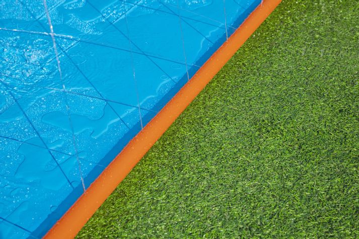 Inbyggda sprinklers sprutar vatten för att hålla banan våt och ger dig en extra snabb åktur. Släng dig på den vattendränkta banan för att se vem som är snabbast i mål.