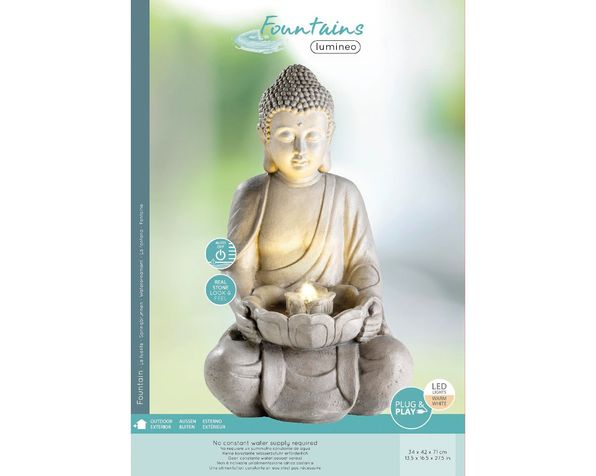 Dekorativt vattenspel med varmvit LED-belysning. Sittande Buddha i betongimitation. Komplett med pump. Sladdlängd: 10 m. Färg: Grå.