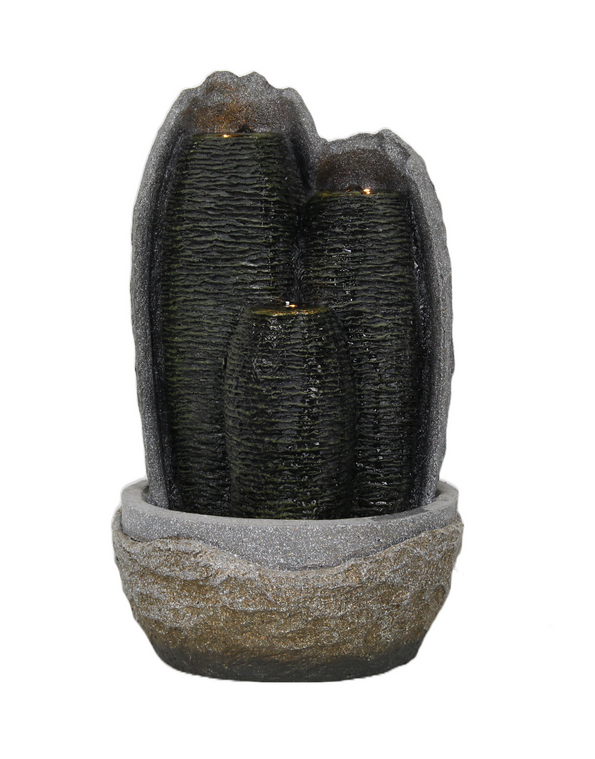 Vatten har en lugnande och avstressande inverkan på oss människor, framförallt att höra ett porlande från ett litet vattenspel eller fontän. Det enda kravet för vattenspel är tillgång till el för att pumpen ska fungera. I övrigt behövs egentligen bara vatten. Vattenspel i stenimitation, tillverkad i glasfiber och natursten. Levereras komplett, med ledlampor och pump. Mycket enkel inkoppling. Slang och lampor är fördraget. Bör förvaras frostfritt under vintertid.