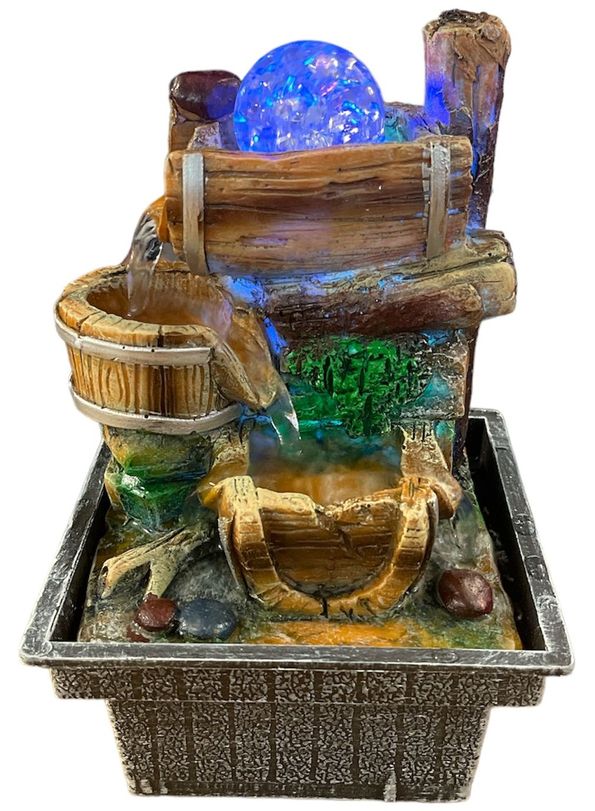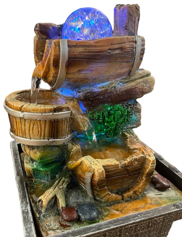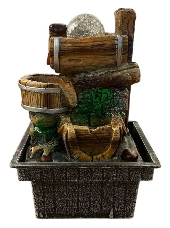 Mini vattenspel i träimitation, tillverkad i (glasfiber och natursten) levereras komplett, med ledlampa, pump med 140 cm kabel, slang och vattenreservoar. Mycket enkel inkoppling. Ett eluttag krävs. Bör förvaras frostfritt under vintertid. Reservpump finns att köpa vid behov (Art nr: 902072). Produktstorlek: 13x13x19,5 cm