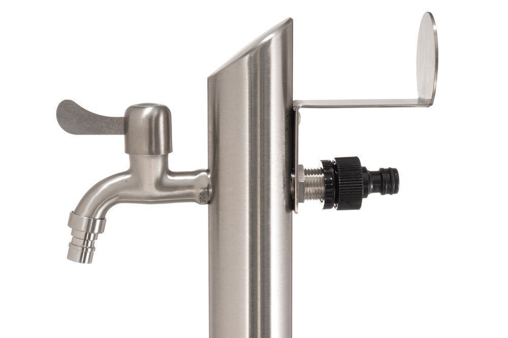 Rostfri trädgårdsblandarpelare. Snygg och praktisk vattenpelare för vattning av blommor, handtvätt etc. i trädgården. Pelaren har slanganslutning och slanghållare för trädgårdsslang.