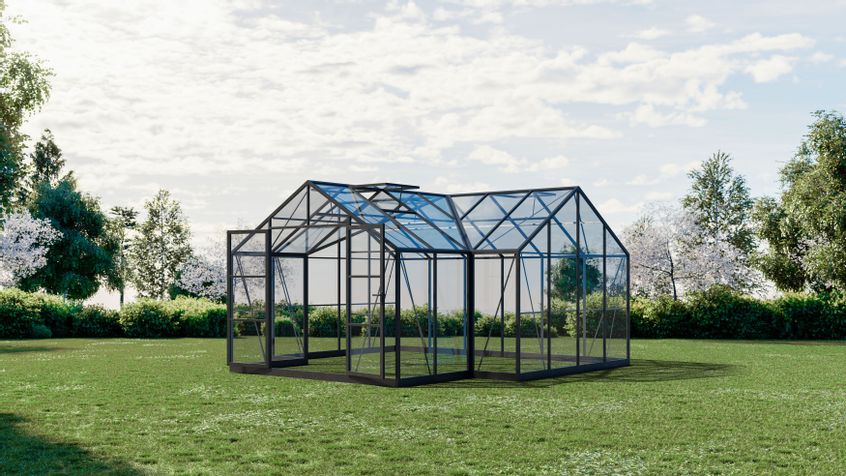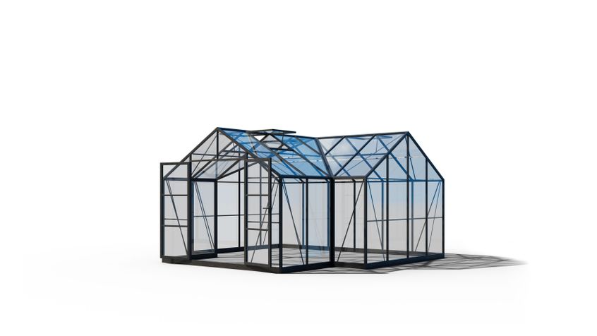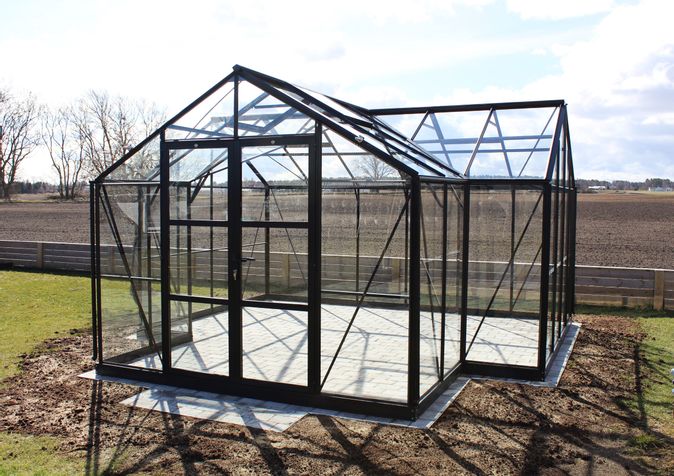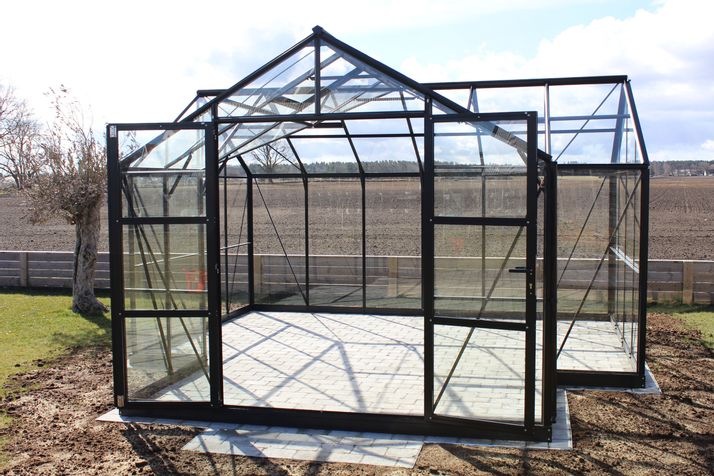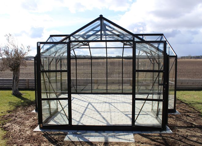Växthus Begonia 17,65 kvm är ett extremt stabilt och väldigt prisvärt växthus tillverkat i svart pulverlackerad aluminium. Passar utmärkt för dig som önskar gott om plats för att odla eller umgås. Växthuset är utrustat med kraftiga låsbara dubbeldörrar med en dörröppning på 139 cm, även dessa tillverkade av kraftig aluminium.
