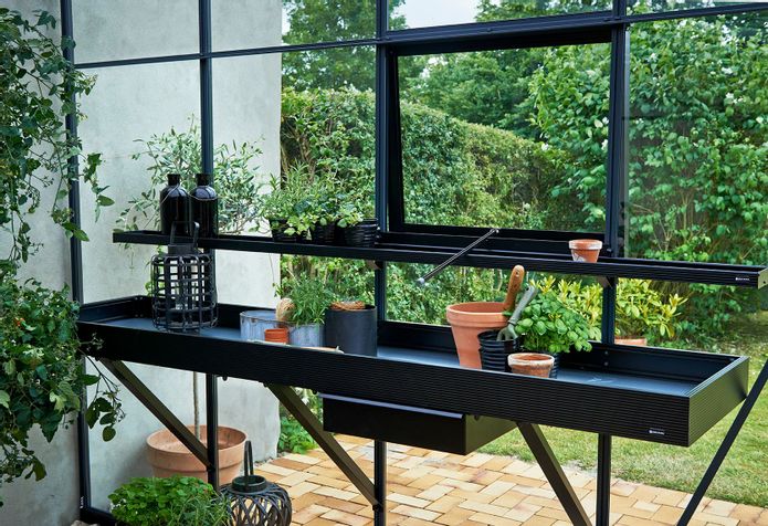 Ett praktiskt bord i 3 sektioner som monteras i växthusets profiler och ger bra arbetsyta som inte tar upp för mycket plats. På bordets undersida finns en låda till förvaring av trädgårdsredskap, fröer m.m.