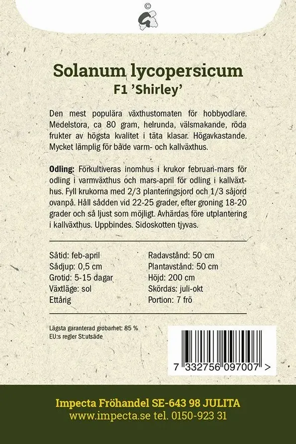 Den mest populära växthustomaten för hobbyodlare. Medelstora, ca 80 gram, helrunda, välsmakande, röda frukter av högsta kvalitet i täta klasar. Högavkastande. Mycket lämplig för både varm- och kallväxthus. Odling från frö: Förkultiveras inomhus i krukor februari-mars för odling i varmväxthus och mars-april för odling i kallväxthus. Fyll krukorna med 2/3 planteringsjord och 1/3 såjord ovanpå. Täck sådden med klar plast försedd med lufthål. Håll sådden vid 22-25 grader, efter groning 18-20 grader och så ljust som möjligt. Avhärdas före utplantering i kallväxthus. Uppbindes. Sidoskotten tjyvas. Portionsmängd: 7 frö Utvecklingstid, dagar: 75 Växtläge: sol Höjd: 200 cm Färg: Röd Såtid: feb-april Grotid: 5-15 dagar Blomtid/Skördetid: juli-okt Årighet: Ettårig