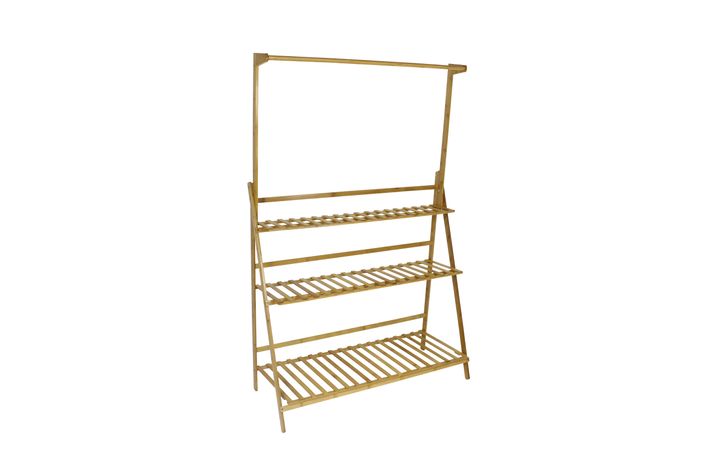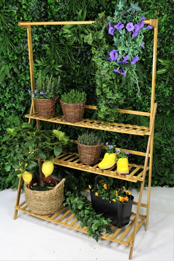 Snygg växttrappa med 3 hyllplan och en stång för att hänga tex amplar eller andra dekorationer. Trappan är tillverkad av trä.