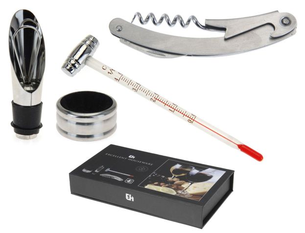Innehåller: Vinöppnare, hällpip, droppring och en vintermometer.