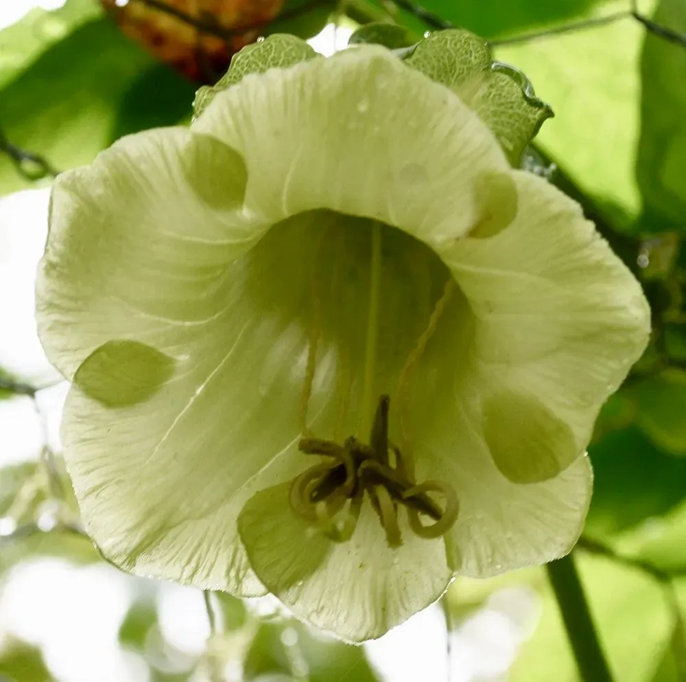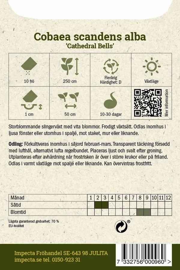 Storblommande slingerväxt med vita blommor. Frodigt växtsätt. Odlas inomhus i ljusa fönster eller utomhus i spaljé, pergola eller liknande.