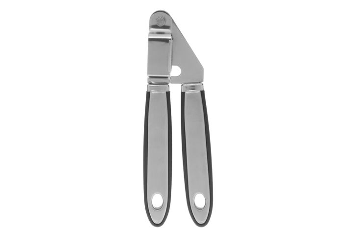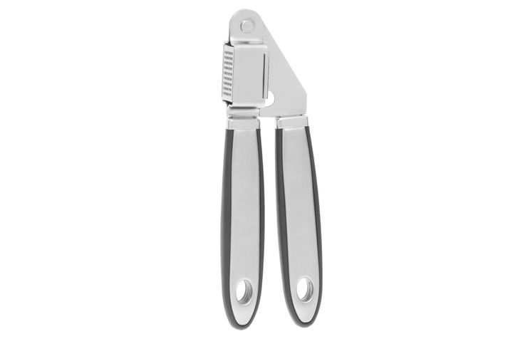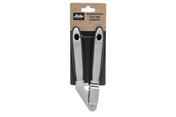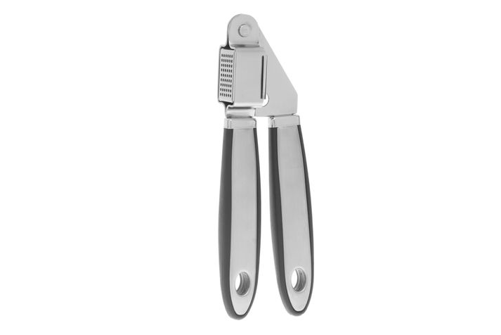 Vitlökspress gjord i rostfritt stål med gummihandtag.