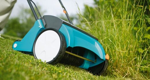 En vertikalskärare använder roterande knivar som skär ner i jorden, river upp gammalt gräs och mossa, och stimulerar gräsrötterna att bilda nya plantor. Kratta bort allt löst material efter vertikalskärningen och stödså vid behov kala fläckar med nya gräsfrön. Avsluta med att tillföra ny näring till jorden.